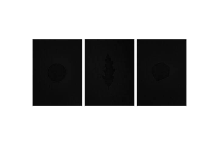 La série noire rassemble trois tableaux sur lesquels sont reproduites les silhouettes se découpant dans la couche de poussière figée entre les verres de la série blanche. La poudre de charbon, appliquée et fixée sur la toile, se fond ou se détache de la surface selon le point de vue de l’observateur.